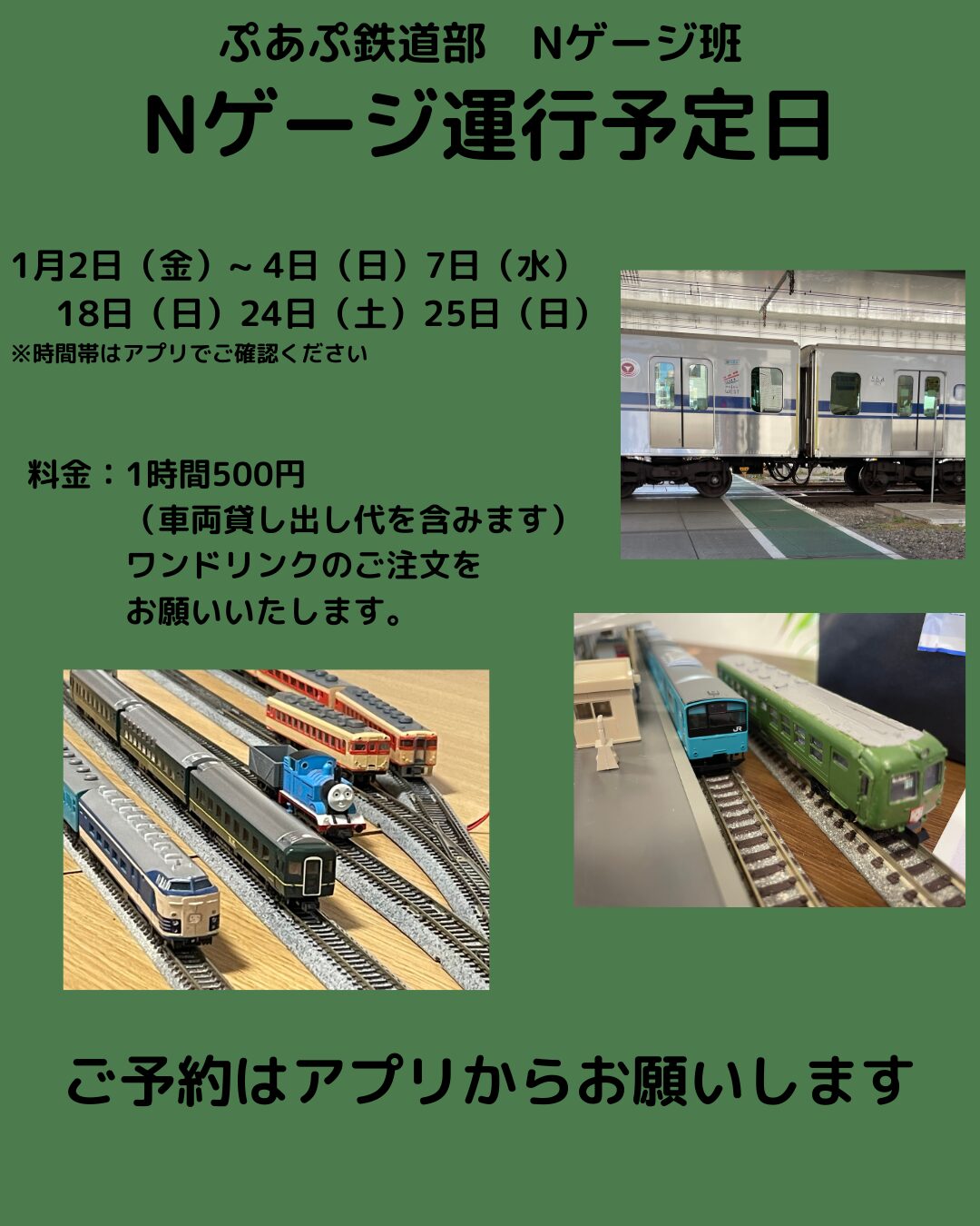 運転日は、月間予定表の🚊マークの付いた日となります。予約が入ればレイアウトを一階に用意します。