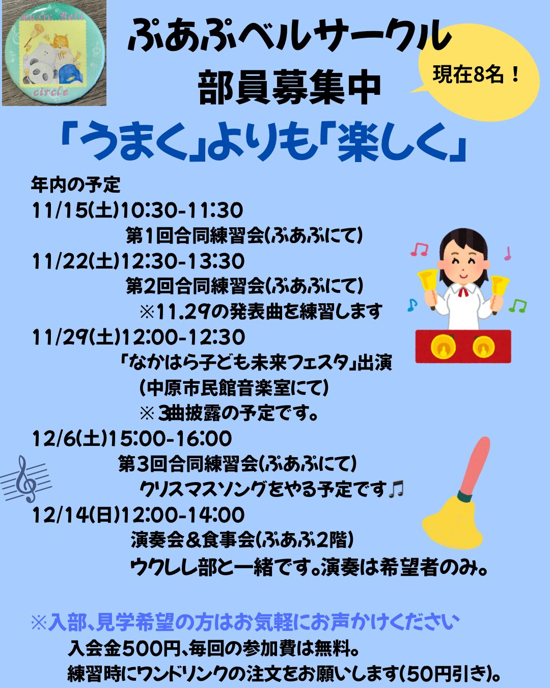 基本的にはベルサークルと同じ日に練習日を設ける予定です。