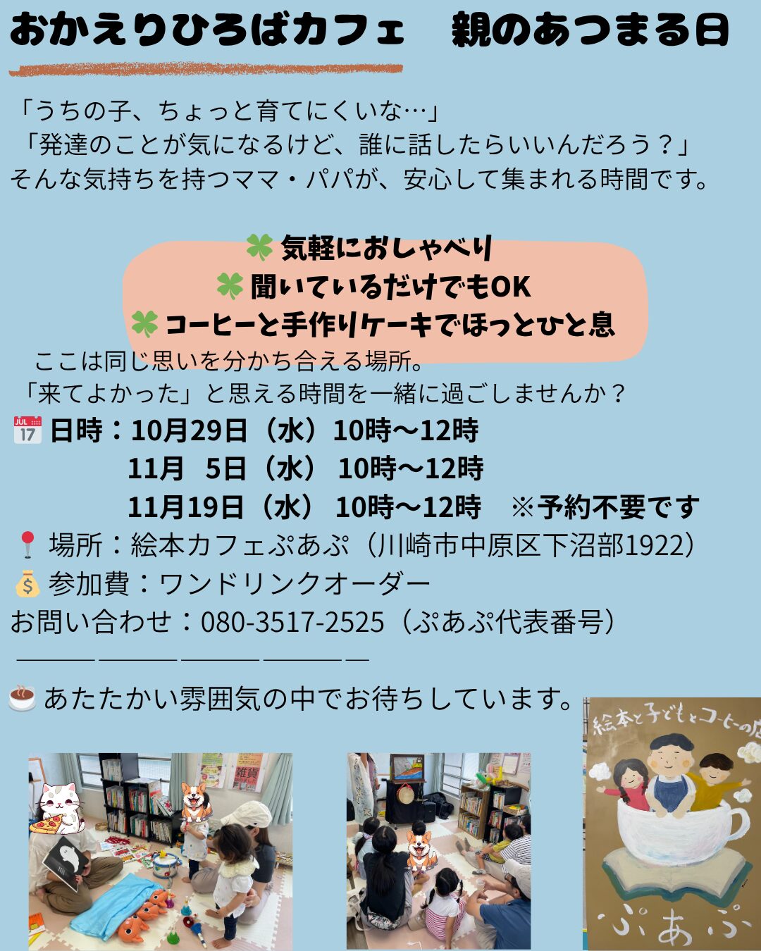 「おかえりひろばカフェ」追加日程です HOME新着情報「おかえりひろばカフェ」追加日程です 先日行われた「おかえりひろばカフェ」。 日程を追加しました。 月に2回程度開催の方向でいきます。お気軽にご参加ください。