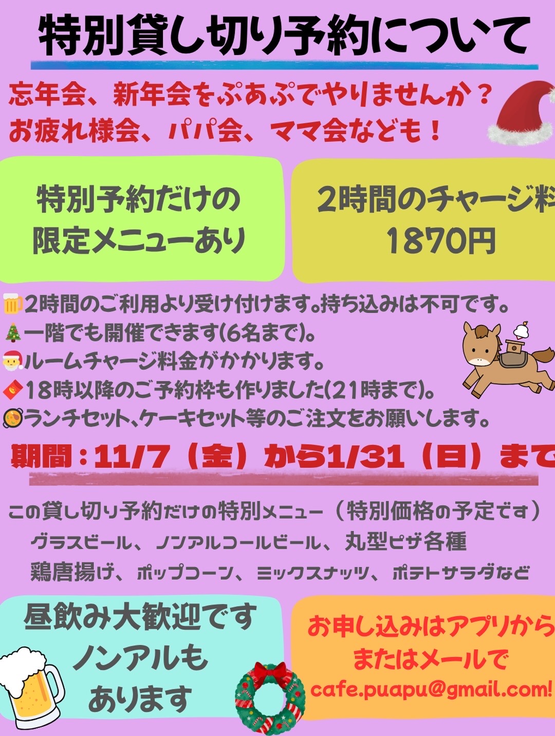 家族や親しいご友人とのお子様連れの忘年会、新年会にはぜひぷあぷをご利用ください。