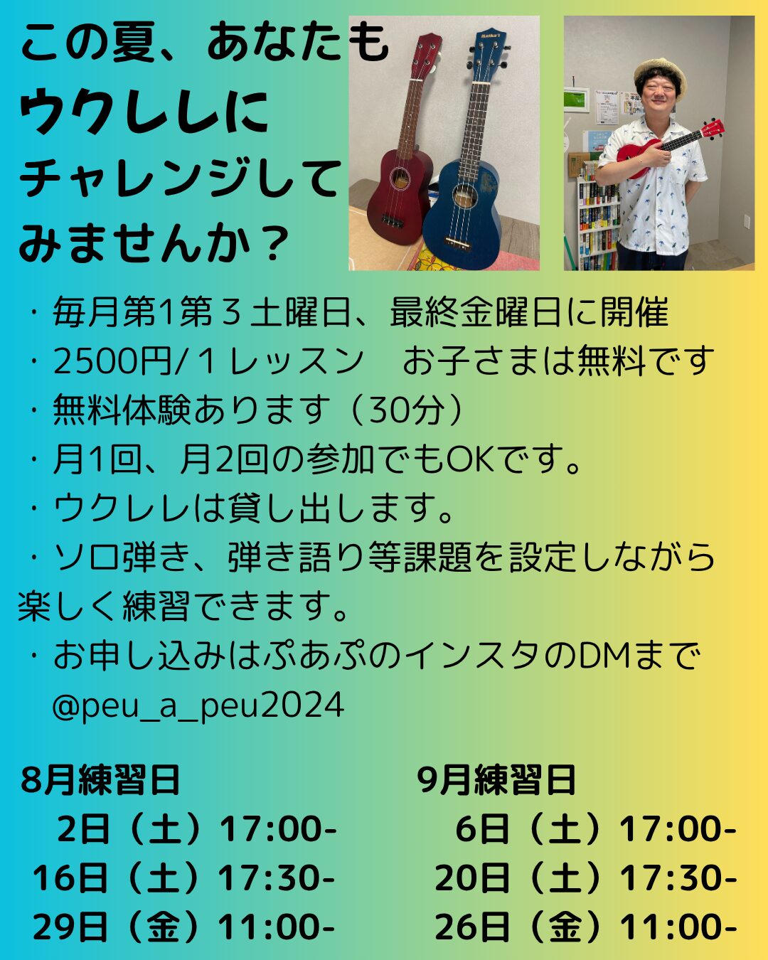 無料体験(30分)あり。ウクレレ貸し出しあり。親子での参加も可能です。